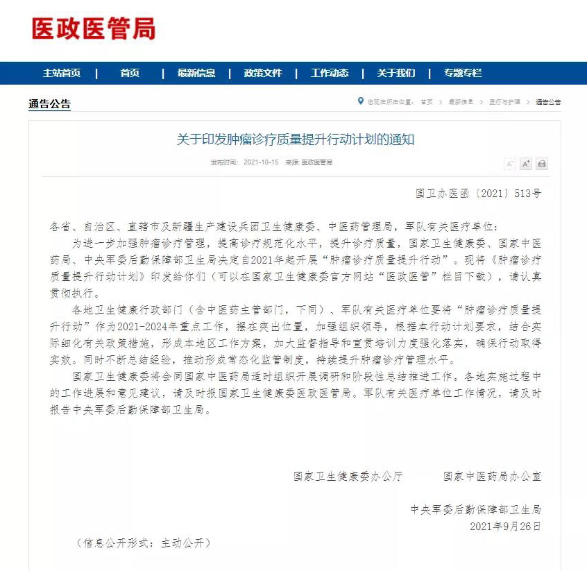 10月15日,国家卫健委宣布《关于印发肿瘤诊疗质量提升行动妄想的通知》,进一步提升肿瘤诊疗质量水平,规范诊疗行为,包管医疗质量清静。
